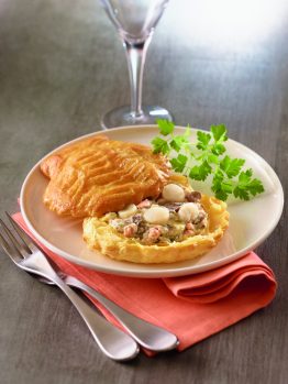 Ingrédients : Farine de BLE, eau, margarine (huiles et graisses végétales: palme, colza), eau, sel, émulsifiants E471, correcteur d’acidité: acide citrique, colorant: caroténoïdes, noix de ST JACQUES 9,6% (Zygochlamys Patagonica, origine : Argentine), champignons de Paris 7,8%, SAUMON Atlantique 7,5% (Salmor salar), poireau 4,6%, CREME fraîche, OEUF frais entier, vin blanc (SULFITES), huile de colza, amidon modifié, sel, échalotes, fumet de POISSON aromatisé (sel, POISSON en poudre, arômes naturels, plante aromatique, saccharose, maltodextrine, huile de tournesol), épaississant: méthylcellulose, sucre, arôme (POISSON, LACTOSE), colorant: caroténoïdes.